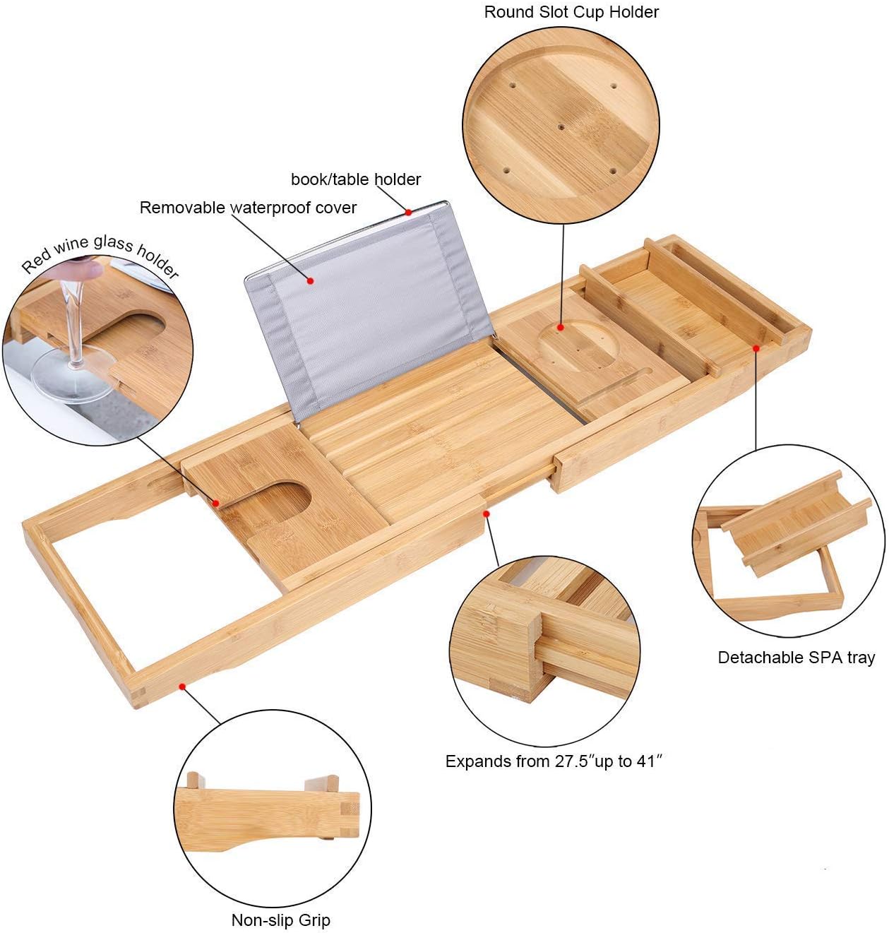 New homfa bamboo bathtub tray 29.5 inches bath table adjustable sliding caddy tray with extending sides, cellphone tray and wineglass holder : Created to bring everlasting beauty; If you live with others, including children or a partner, then you will also find that the space becomes cluttered. Great accessory for books or tablet computers. When you are taking a bath, you could enjoy your wine, play your phone and read your favorite books, then you will feel really comfortable and relax.